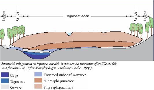Højmosen dannes ofte i en sø og breder sig derfra. Hvert år hæver højmosen sig ca. 1 mm.