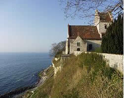 På billedet ses Højerup gl. kirke, som i 1928 delvist styrtede i havet under et stort skred