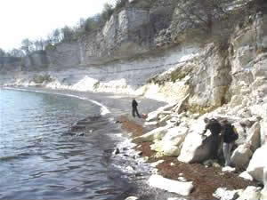 På billedet ses Stevns Klint, hvor man tydeligt ser grænsen mellem det hårde bryozolkalk øverst og det bløde skrivekridt nederst.
