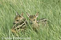 De første 4 uger af lammets liv er det alene, i 19-20 af døgnets 24 timer. Medens moderen søger efter føde ligger lammet trykket mod jorden i det høje græs |