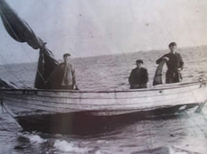 Fiskeriet har haft stor betydning for Furboerne. På billedet ses 3 Fur fiskere på vej ud på fjorden i en af de karakteristiske sjægte fra Fur og Limfjorden. |