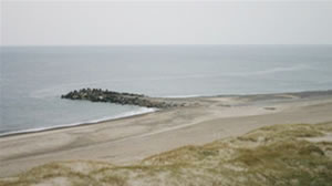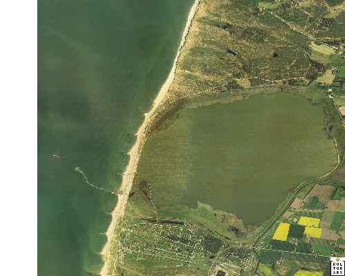 På billedet ses et udsnit af vestkysten mellem Agger og Lodbjerg. Bemærk at kysten er mere eroderet øverst i billedet, hvor der ikke er kystsikring (nord for Flade Sø)