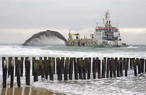 Store skibe, kaldet sandsugere eller sandpumper, sejler et godt stykke ud fra kysten og suger sand op fra havbunden fra omkring 20 m dybde. Når lasten er fuld sejler det ind mod kysten, til det går på grund. Ved kysten bliver sandet enten pumpet gennem en rørledning ind på stranden eller, pumpet ud på havbunden lige foran stranden.