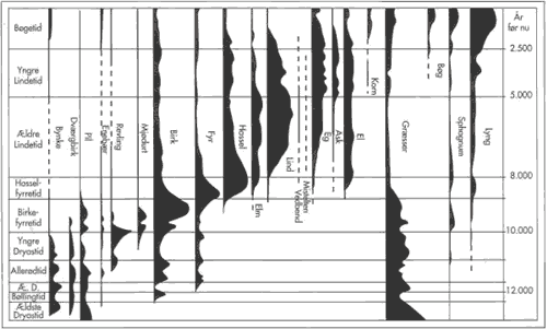 Eksempel på et pollendiagram som viser skovens udvikling fra sidste istid og frem til i dag. Yderst til højre kan man følge lyngens pollenudvikling, som stiger kraftigt i Danmark omkring den tid hvor man begyndte at dyrke jorden.