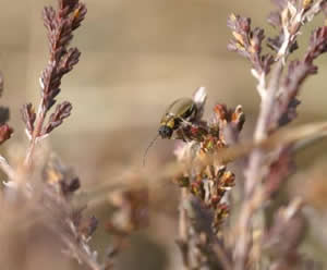 Lyngens Bladbille. Både det voksne insekt og larverne gnaver af lyngens blade. |