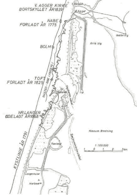 Historisk kort over Aggertangen. På kortet kan man se placeringerne af kystlinjen i år 1791, og placeringerne af de små landsbyer der engang fandtes på tangen.