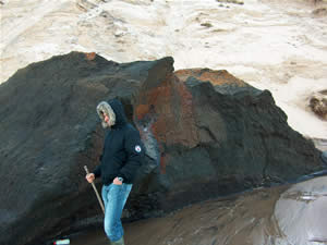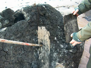 På billede 3 ser man et stykke træ blive taget ud af noget, der i første omgang ligner et tørvelag af en slags – men i virkeligheden er det et stykke træ, som er blevet aflejret for måske 30 millioner år siden. Det er sandsynligvis et stykke drivtømmer, som sank til bunds da glimmerleret blev aflejret.