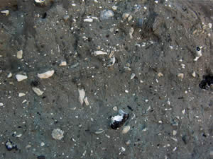 Det sort-brune oligocæne glimmerler ses ofte som løsrevne flager, der er indlejret i istidsaflejringer, eller ligger som formationer på stranden – se billede 1.