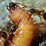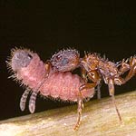 Når myren har fundet larven, begynder den at føle på larven, hvilket udløser en lille honningdråbe. Myren spiser straks honningdråben, og udsender straks dufte og lyde, der fortæller andre myre i området, at der er mad. Dette bevirker, at der hurtigt er op til ti myrer, der nyder godt af den honning som larven udskiller. Efter en halv til en hele time er interessen for larven stilnet af, og det er kun den myre som fandt larven, der er tilbage. Nu er larven kommet til at lugte af myre rede og pludselig indtager den en S-formet stilling hvilket får myren til at gribe fat i larven med sine kindbakker. Larven dufter og føles nu ligesom en myrelarve. Myren tror nu, at larven er en myrelarve på vildspor og bærer den hjem i myrereden. Myren er blevet narret. Larven begynder, at spise myrelarver, hvilket er uheldigt for myresamfundet, der kommer til at lide hårdt under larvens grådighed. Når larven bliver bragt hjem i myrereden, er den på størrelse med en udvokset myrelarve, men allerede efter 8-10 dage er den på størrelse med en dronningelarve.