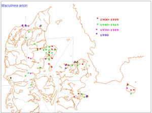 Kortet viser den sortplettede blåfugls gradvise tilbagegang. |