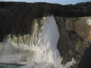 Et kæmpe skred med imellem 450.000- 500.000 ton kridt, ler, jord og træer i et stort virvar. Skredet rakte 300 m ud fra kysten, og havde taget ca. 100 bøgetræer med. |