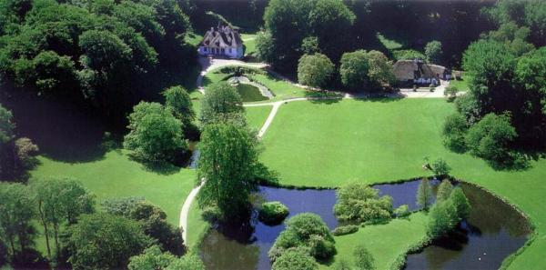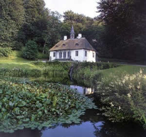 Liselund Park (Liselund Slot til venstre, til højre Schweizerhytten) – Foto: http://www.moenia.dk |