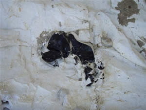 Illustrationen forestiller et snit gennem havbunden i kridttiden, hvor man finder Thalassinoider, der graver brede gange i det øverste lag. Det er i disse gange hovedparten af flinten bliver dannet.