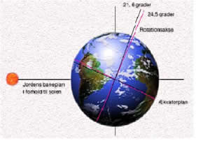 Jordens varierende hældning mellem 21,6° og 24.5° kan være skyld i store klimaændringer på jorden. – Foto http://www.phys.au.dk/