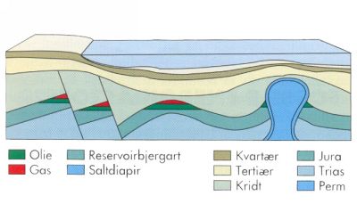 På illustrationen ses sprækkezoner, hvor gas og olie samler sig nær overfladen.
