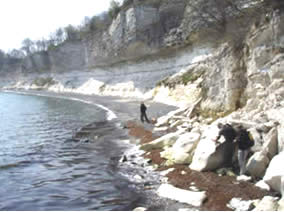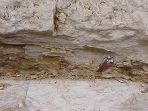 På billedet ses Stevns klint hvor man tydeligt ser grænsen mellem det hårde bryozolkalk øverst og det bløde skrivekridt nederst.